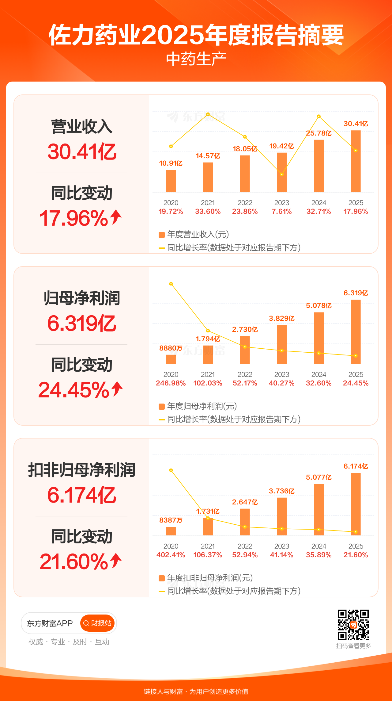 佐力药业4月27日发布2025年年报显示,公司全年实现营业收入30.41亿元,同比增长17.96%;归母净利润6.32亿元,同比增长24.45%;扣非归母净利润6.17亿元,同比增长21.60%。
