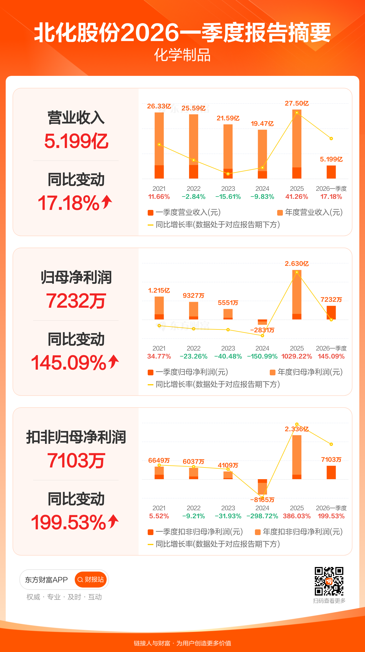 北化股份4月27日发布2026年一季报显示,公司一季度实现营业收入5.20亿元,同比增长17.18%;归母净利润7232.02万元,同比增长145.09%;扣非归母净利润7102.80万元,同比增长199.53%。