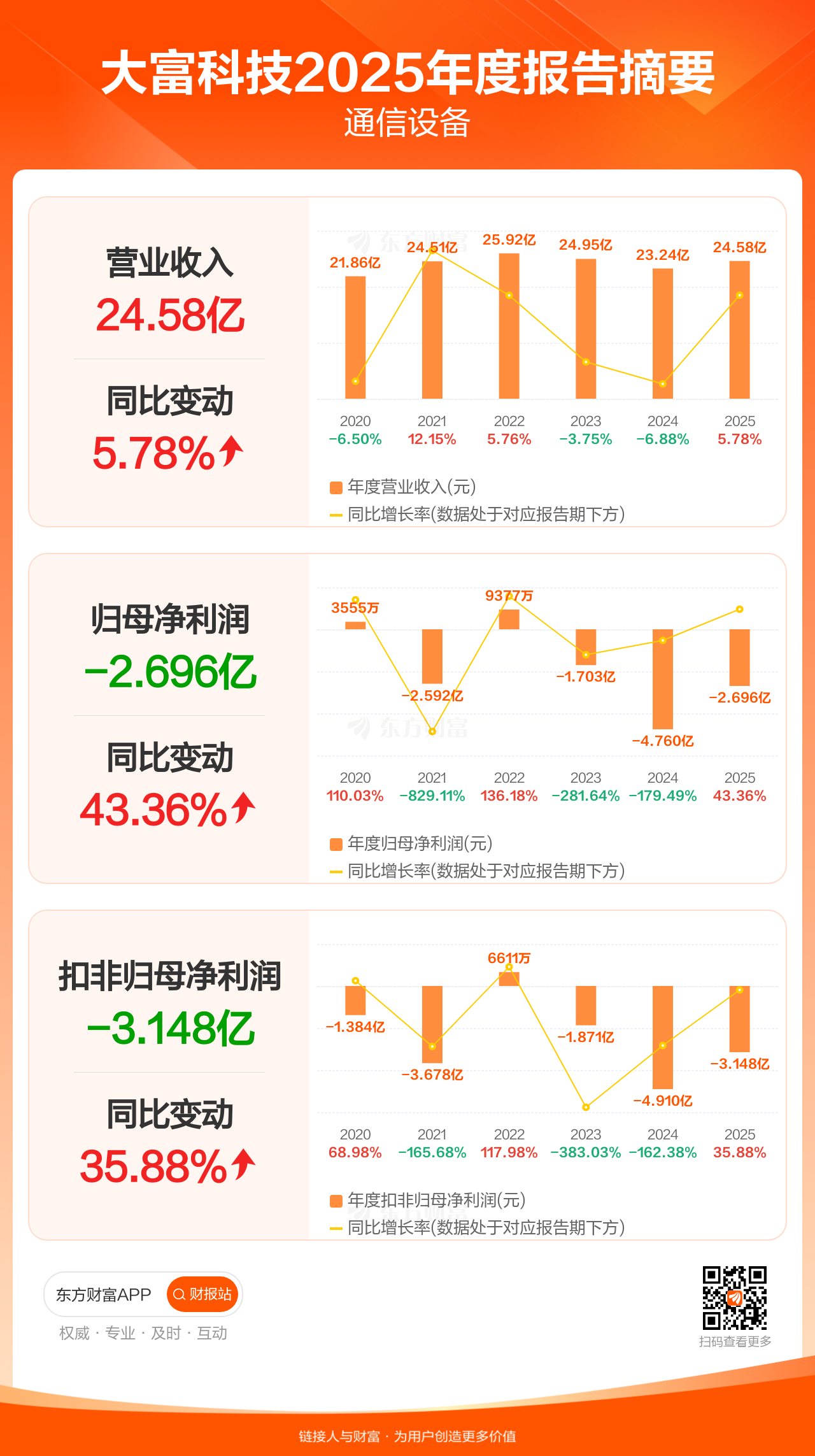 大富科技4月27日发布2025年年报显示,公司全年实现营业收入24.58亿元,同比增长5.78%;归母净利润-2.70亿元;扣非归母净利润-3.15亿元。