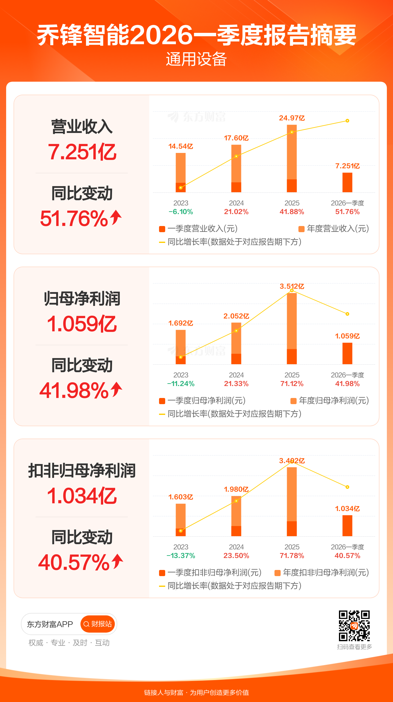 乔锋智能4月27日发布2026年一季报显示,公司一季度实现营业收入7.25亿元,同比增长51.76%;归母净利润1.06亿元,同比增长41.98%;扣非归母净利润1.03亿元,同比增长40.57%。