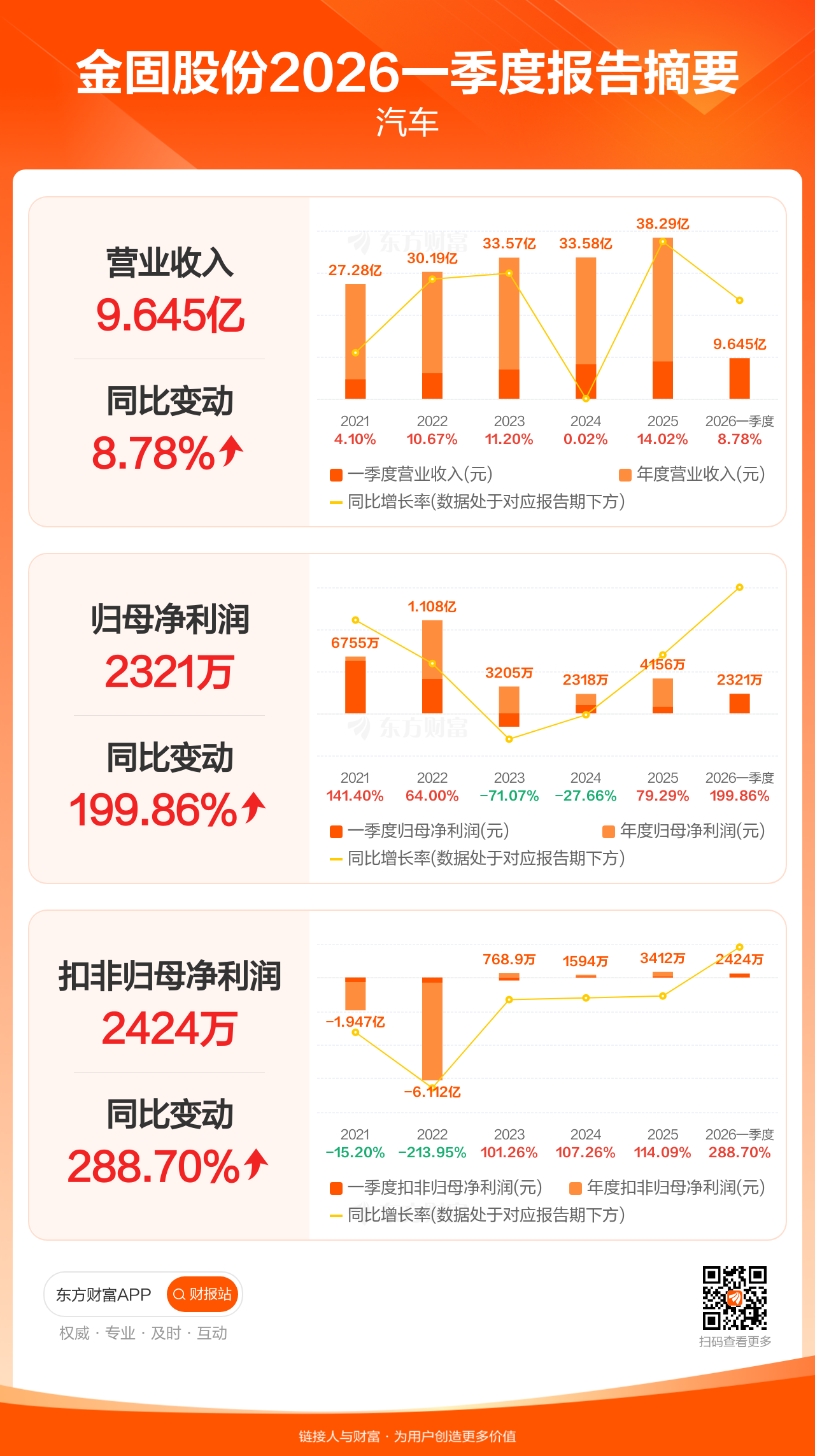 金固股份4月27日发布2026年一季报显示,公司一季度实现营业收入9.64亿元,同比增长8.78%;归母净利润2320.59万元,同比增长199.86%;扣非归母净利润2423.79万元,同比增长288.70%。