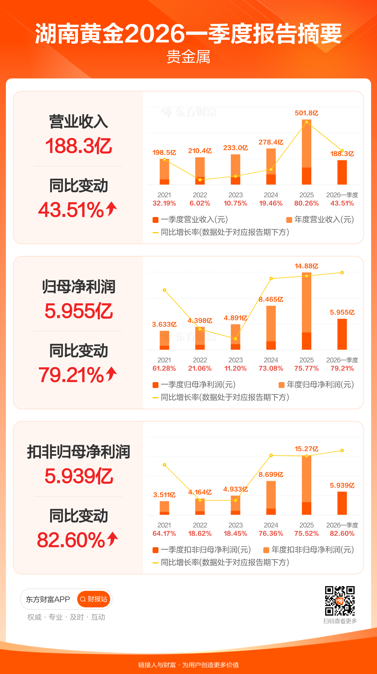 湖南黄金4月27日发布2026年一季报显示,公司一季度实现营业收入188.30亿元,同比增长43.51%;归母净利润5.96亿元,同比增长79.21%;扣非归母净利润5.94亿元,同比增长82.60%。