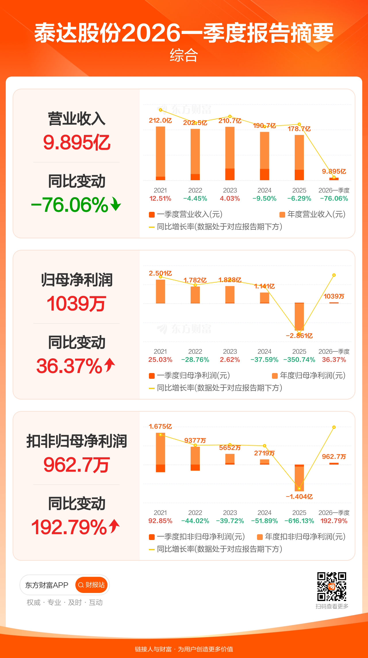 泰达股份4月27日发布2026年一季报显示,公司一季度实现营业收入9.89亿元,同比下滑76.06%;归母净利润1038.73万元,同比增长36.37%;扣非归母净利润962.74万元,同比增长192.79%。