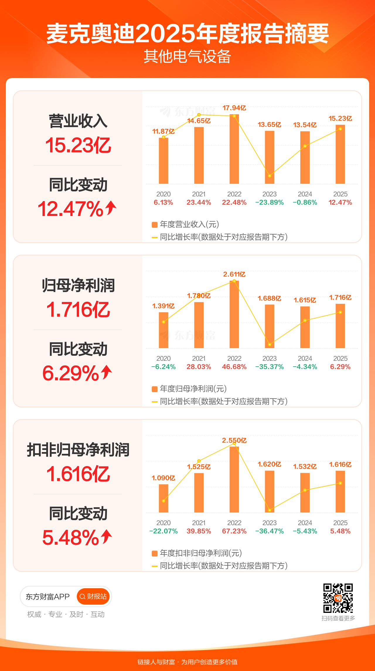 麦克奥迪4月27日发布2025年年报显示,公司全年实现营业收入15.23亿元,同比增长12.47%;归母净利润1.72亿元,同比增长6.29%;扣非归母净利润1.62亿元,同比增长5.48%。