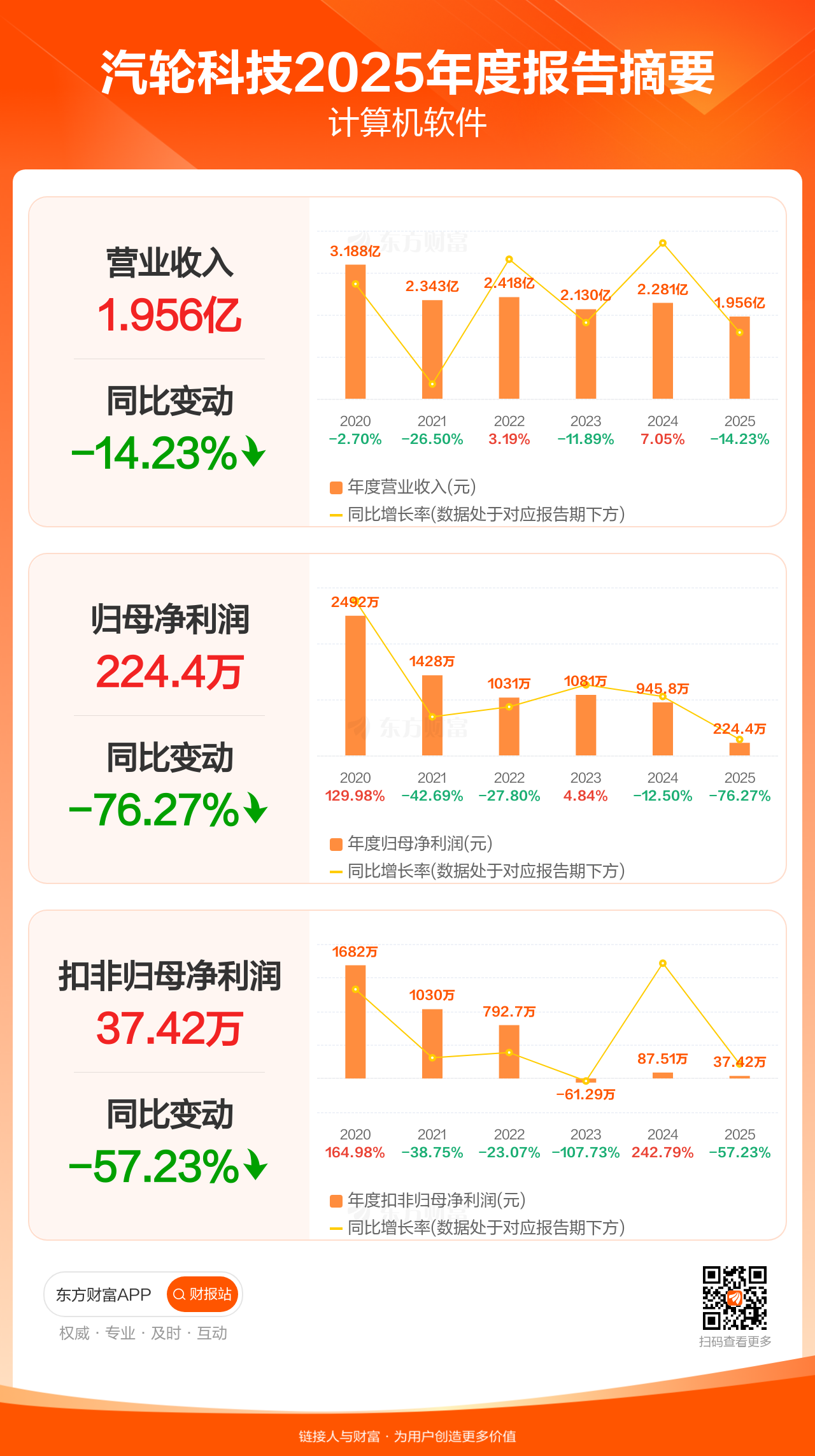 汽轮科技4月27日发布2025年年报显示,公司全年实现营业收入1.96亿元,同比下滑14.23%;归母净利润224.43万元,同比下滑76.27%;扣非归母净利润37.42万元,同比下滑57.23%。