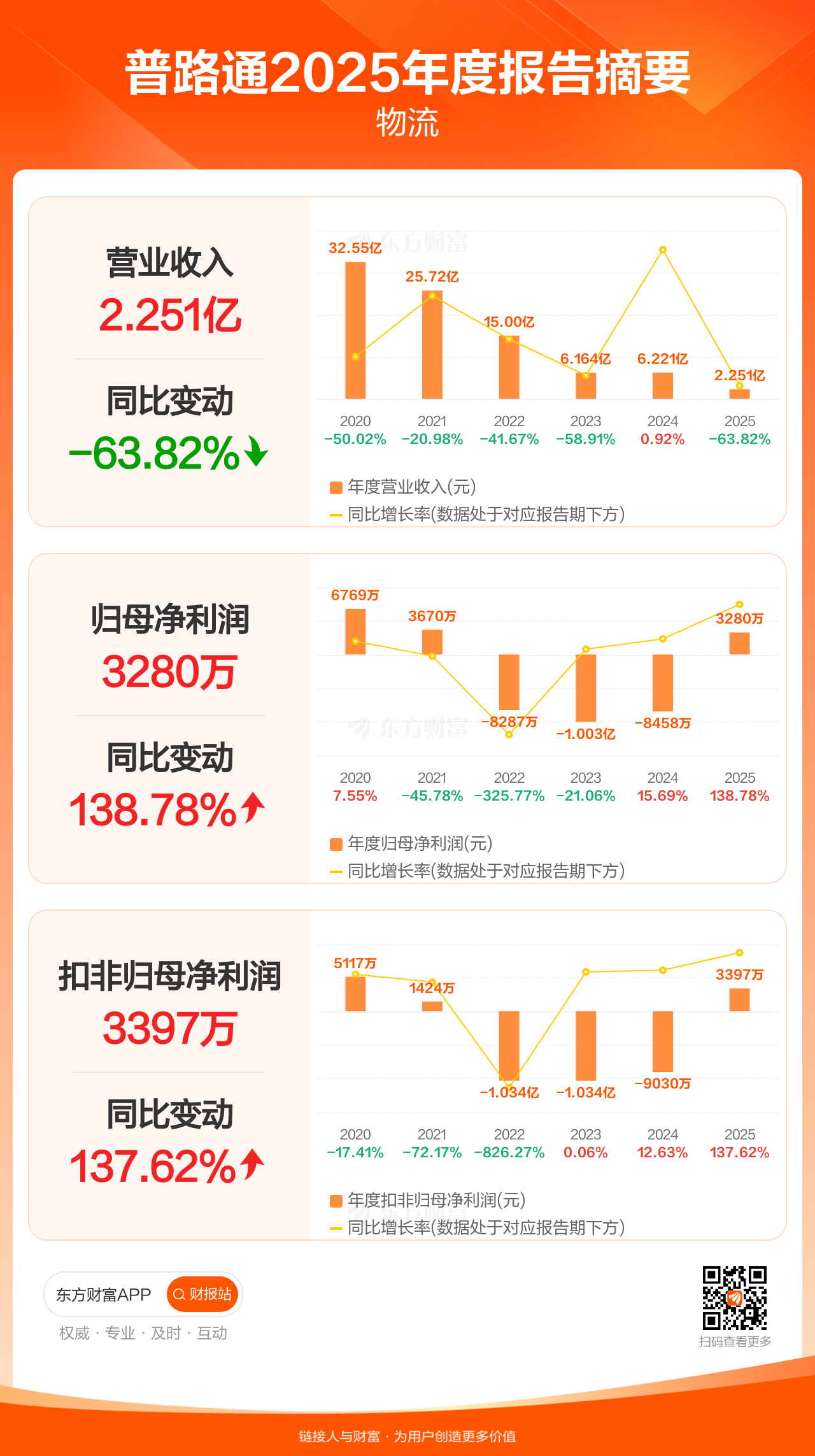 普路通4月27日发布2025年年报显示,公司全年实现营业收入2.25亿元,同比下滑63.82%;归母净利润3279.59万元,同比增长138.78%;扣非归母净利润3397.35万元,同比增长137.62%。