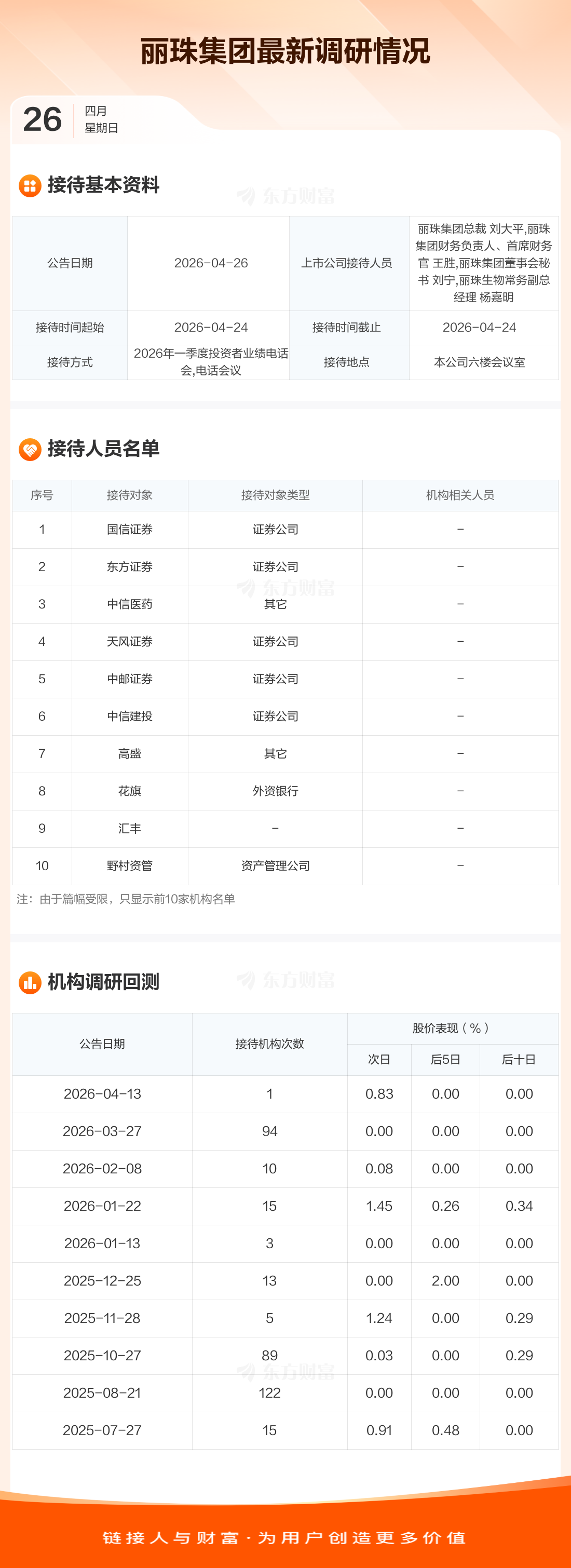 丽珠集团4月26日公告称,4月24日接待国信证券等50家机构调研。接待人员包括丽珠集团总裁 刘大平,丽珠集团财务负责人、首席财务官 王胜,丽珠集团董事会秘书 刘宁,丽珠生物常务副总经理 杨嘉明。