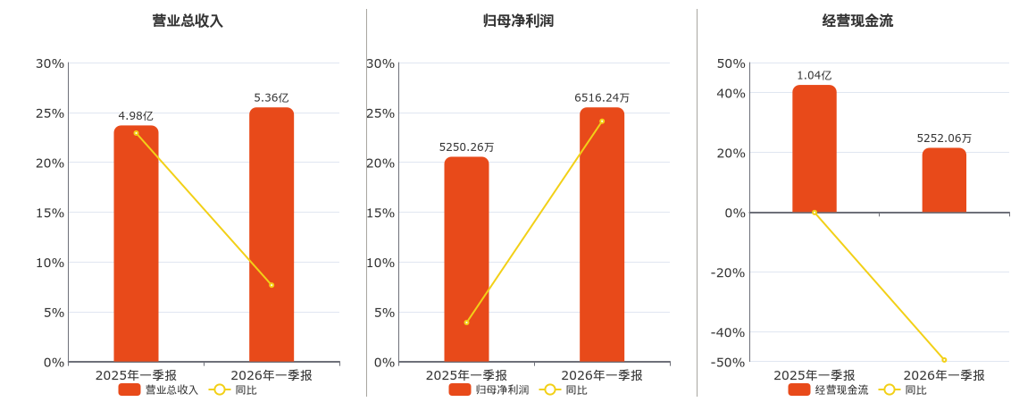 公司营业总收入为5.36亿元,较去年同报告期营业总收入增加3809.49万元,实现4年连续上涨,同比较去年同期上涨7.66%。归母净利润为6516.24万元,较去年同报告期归母净利润增加1265.98万元,实现3年连续上涨,同比较去年同期上涨24.11%。经营活动现金净流入为5252.06万元。