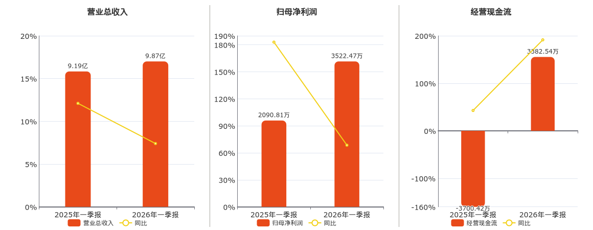 公司营业总收入为9.87亿元。归母净利润为3522.47万元。经营活动现金净流入为3382.54万元。