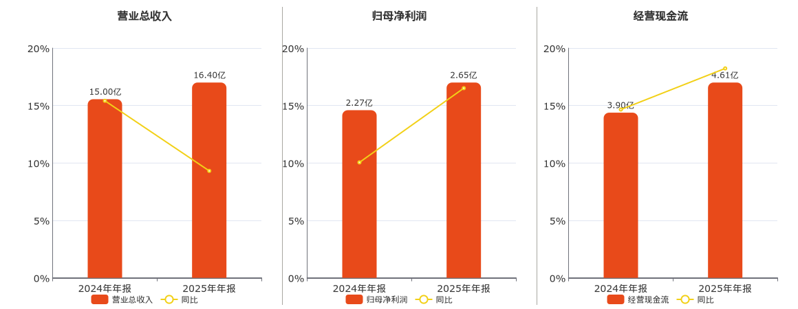 公司营业总收入为16.40亿元。归母净利润为2.65亿元。经营活动现金净流入为4.61亿元。
