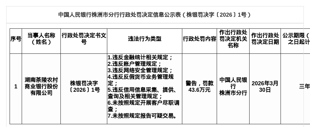 蓝鲸新闻4月27日讯,近日,中国人民银行株洲市分行发布了一张罚单,剑指湖南茶陵农村商业银行股份有限公司。