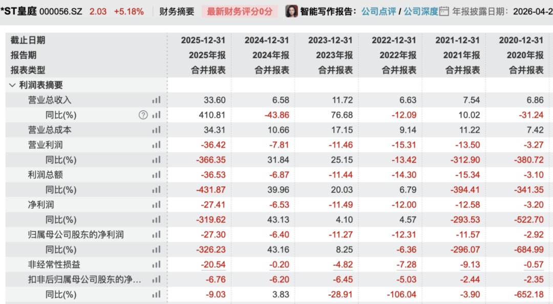 业绩方面,*ST皇庭2025年实现营业收入33.6亿元,同比增长410.81%;归属于上市公司股东的净利润为-27.3亿元,同比下降326.23%。
