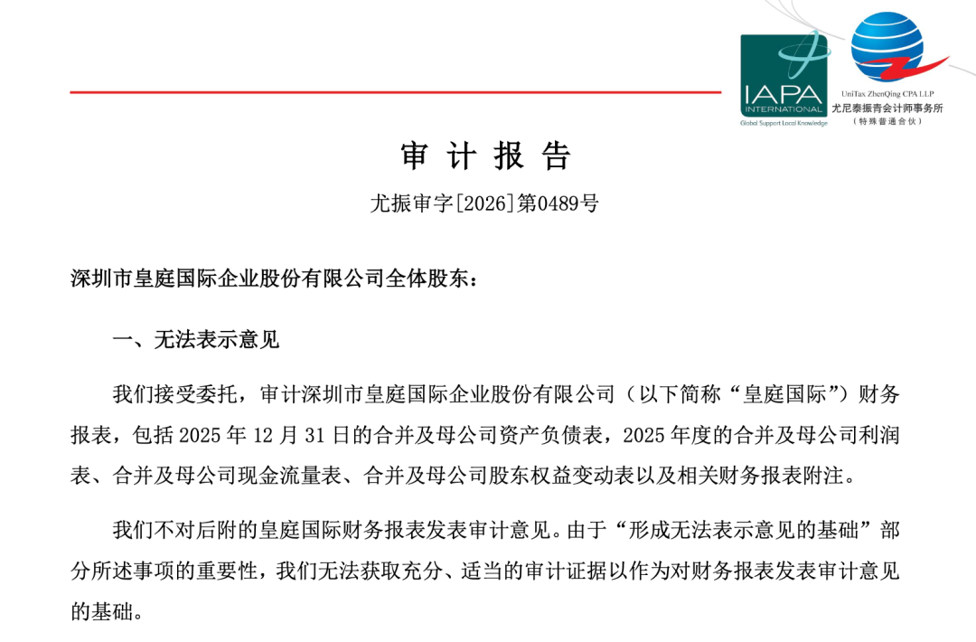 值得注意的是,4月23日,皇庭国际发布了2025年年度报告,尤尼泰振青会计师事务所(特殊普通合伙) 为该公司2025年度财务报表出具了无法表示意见的审计报告,这是A股首份2025年度无法表示意见的财务报表审计报告。