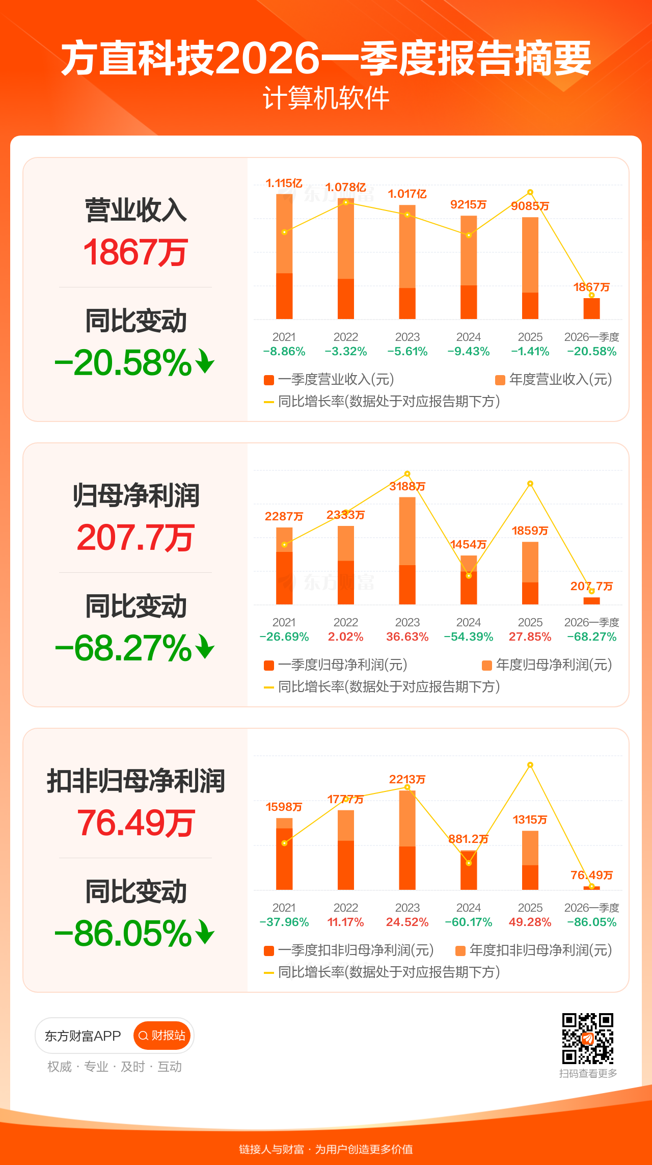 方直科技4月28日发布2026年一季报显示,公司一季度实现营业收入1867.27万元,同比下滑20.58%;归母净利润207.71万元,同比下滑68.27%;扣非归母净利润76.49万元,同比下滑86.05%。