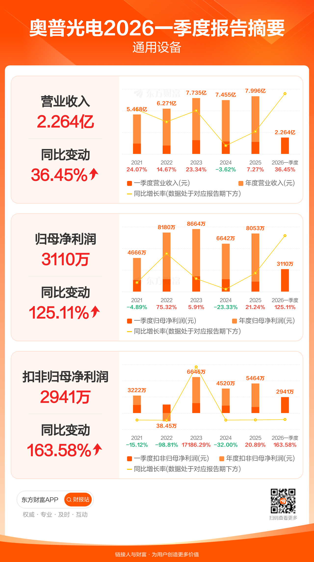 奥普光电4月28日发布2026年一季报显示,公司一季度实现营业收入2.26亿元,同比增长36.45%;归母净利润3109.68万元,同比增长125.11%;扣非归母净利润2941.08万元,同比增长163.58%。