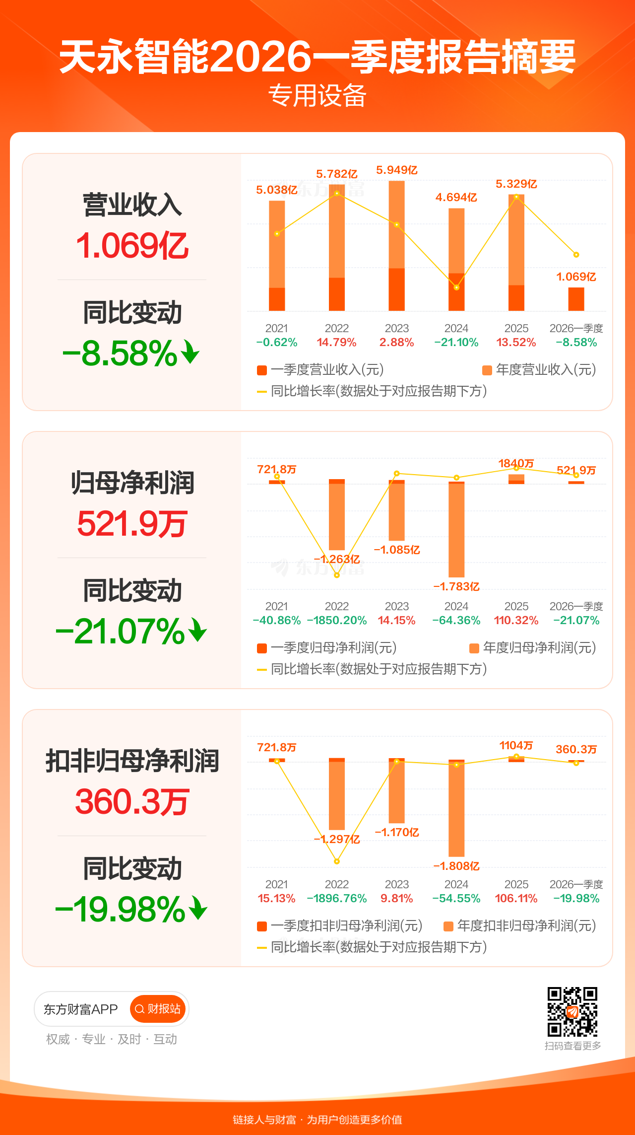 天永智能4月28日发布2026年一季报显示,公司一季度实现营业收入1.07亿元,同比下滑8.58%;归母净利润521.94万元,同比下滑21.07%;扣非归母净利润360.30万元,同比下滑19.98%。