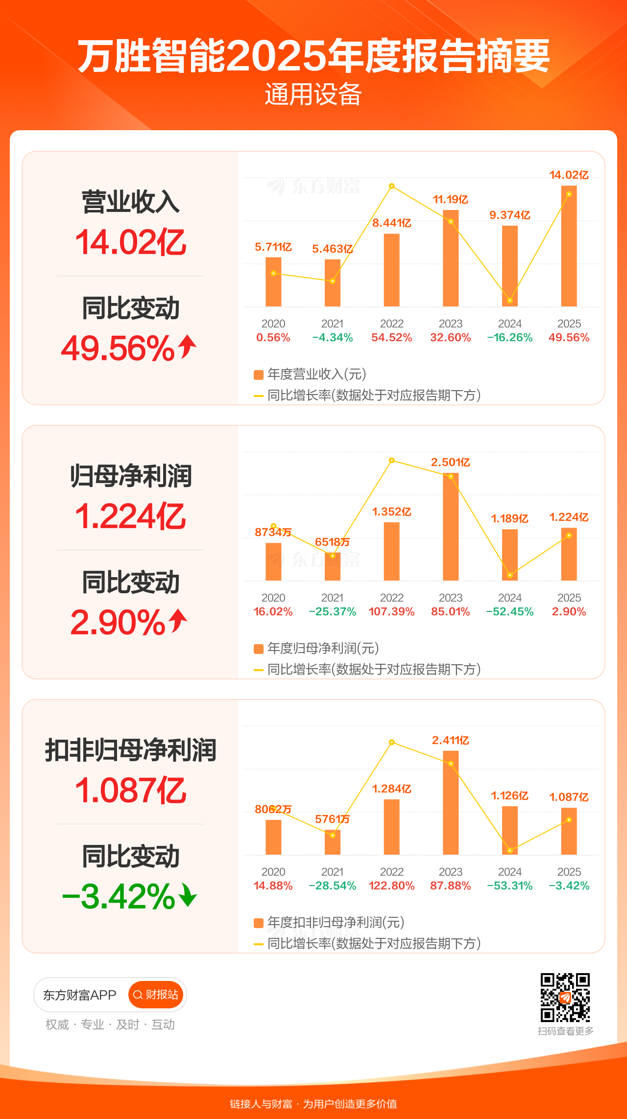 万胜智能4月28日发布2025年年报显示,公司全年实现营业收入14.02亿元,同比增长49.56%;归母净利润1.22亿元,同比增长2.90%;扣非归母净利润1.09亿元,同比下滑3.42%。