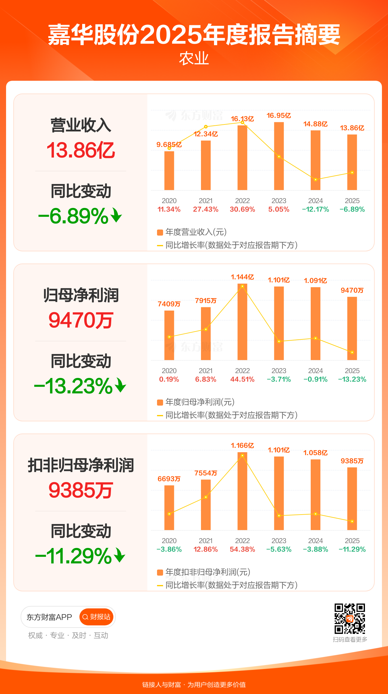 嘉华股份4月28日发布2025年年报显示,公司全年实现营业收入13.86亿元,同比下滑6.89%;归母净利润9470.06万元,同比下滑13.23%;扣非归母净利润9385.12万元,同比下滑11.29%。
