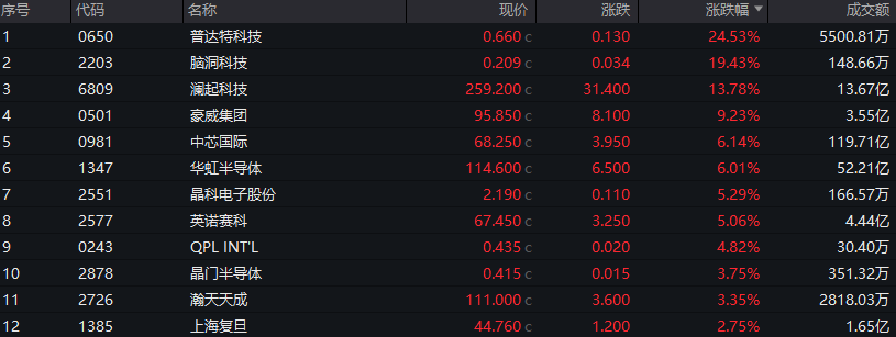 半导体板块领涨,中芯国际涨超6%,华虹半导体涨超6%;光通信股长飞光纤光缆涨超7%。