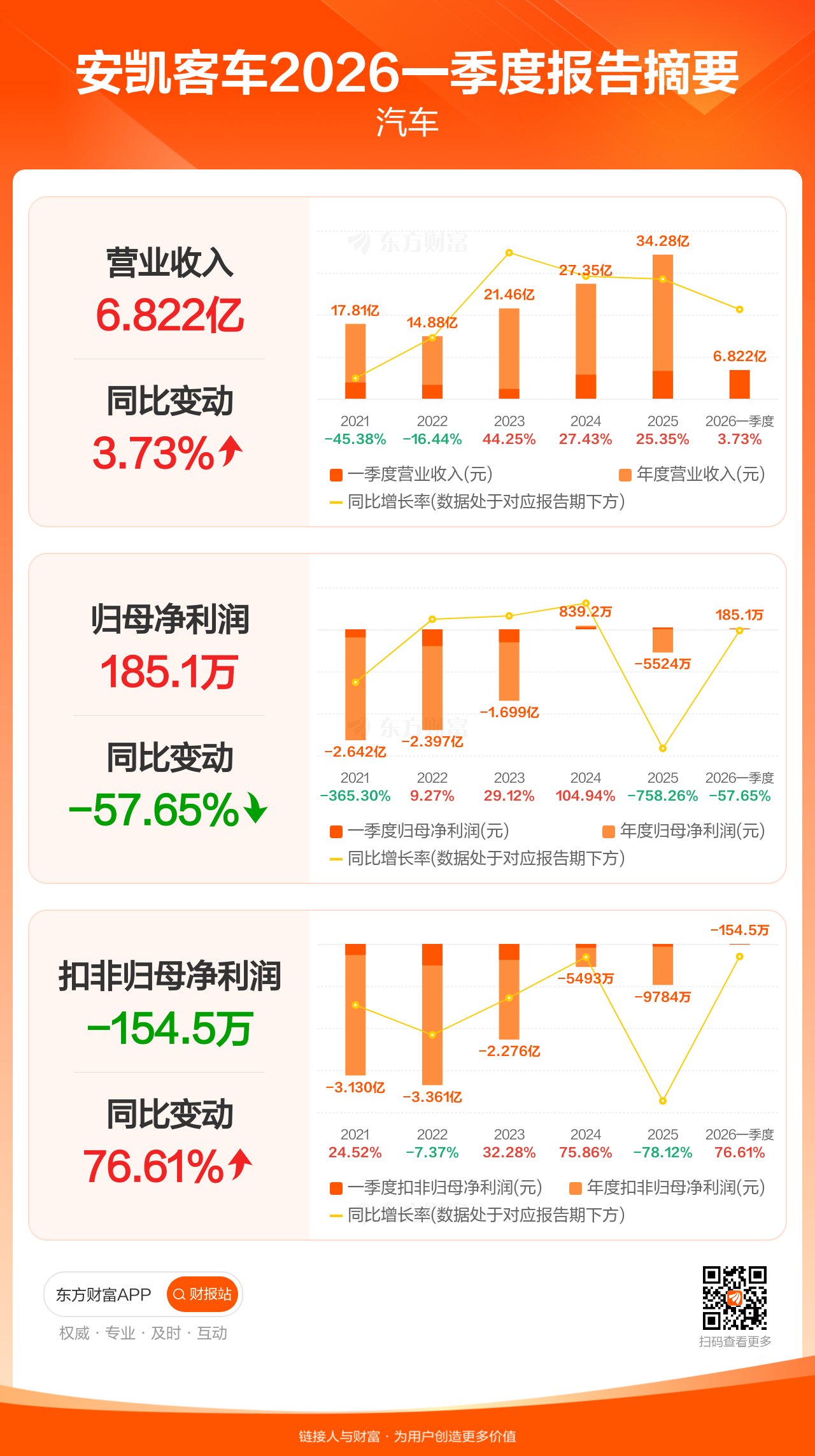 安凯客车4月28日发布2026年一季报显示,公司一季度实现营业收入6.82亿元,同比增长3.73%;归母净利润185.07万元,同比下滑57.65%;扣非归母净利润-154.53万元。