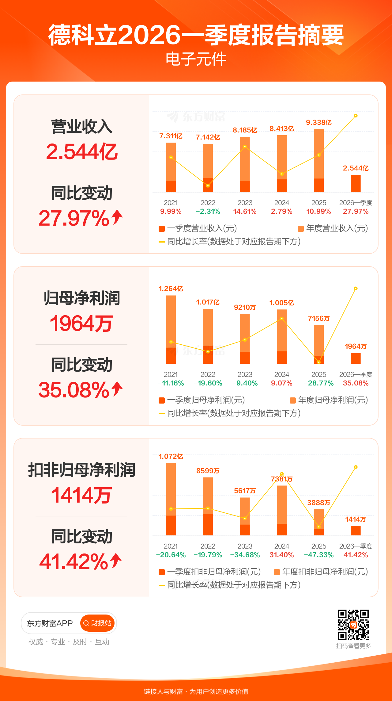 德科立4月28日发布2026年一季报显示,公司一季度实现营业收入2.54亿元,同比增长27.97%;归母净利润1963.90万元,同比增长35.08%;扣非归母净利润1413.53万元,同比增长41.42%。