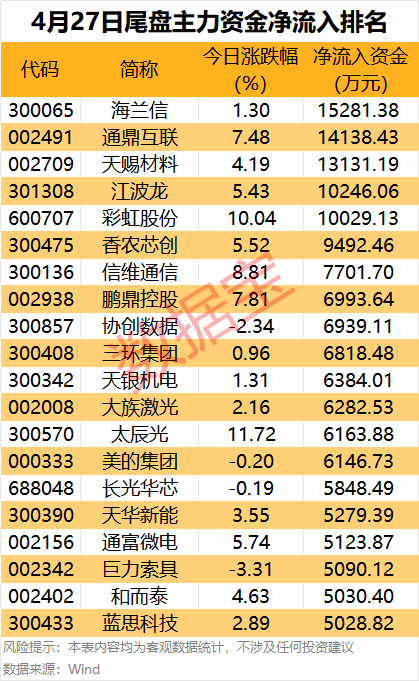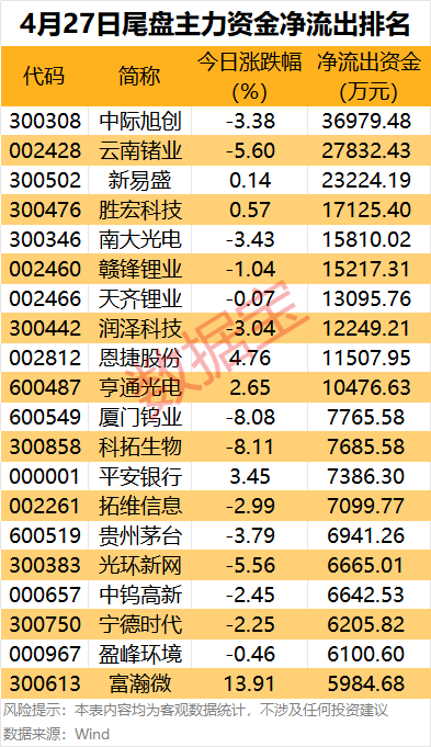 此外,胜宏科技、南大光电、赣锋锂业、天齐锂业和润泽科技等尾盘净流出金额也居前。