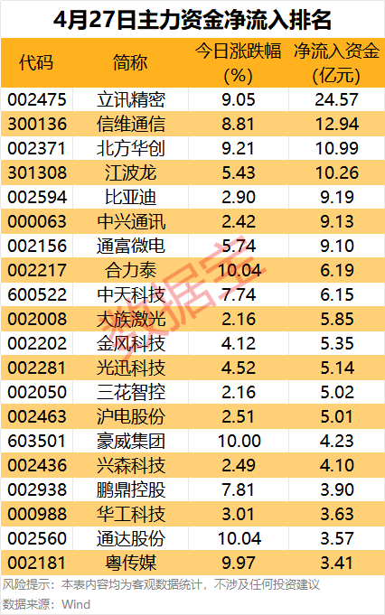 消费电子龙头股立讯精密涨超9%,主力资金净流入24.57亿元,居首。消息面上,4月27日,天风国际证券分析师郭明錤发文称,OpenAI计划自研手机,正与联发科、高通合作开发手机处理器,立讯精密为独家系统协同设计与制造商,预计2028年量产。
