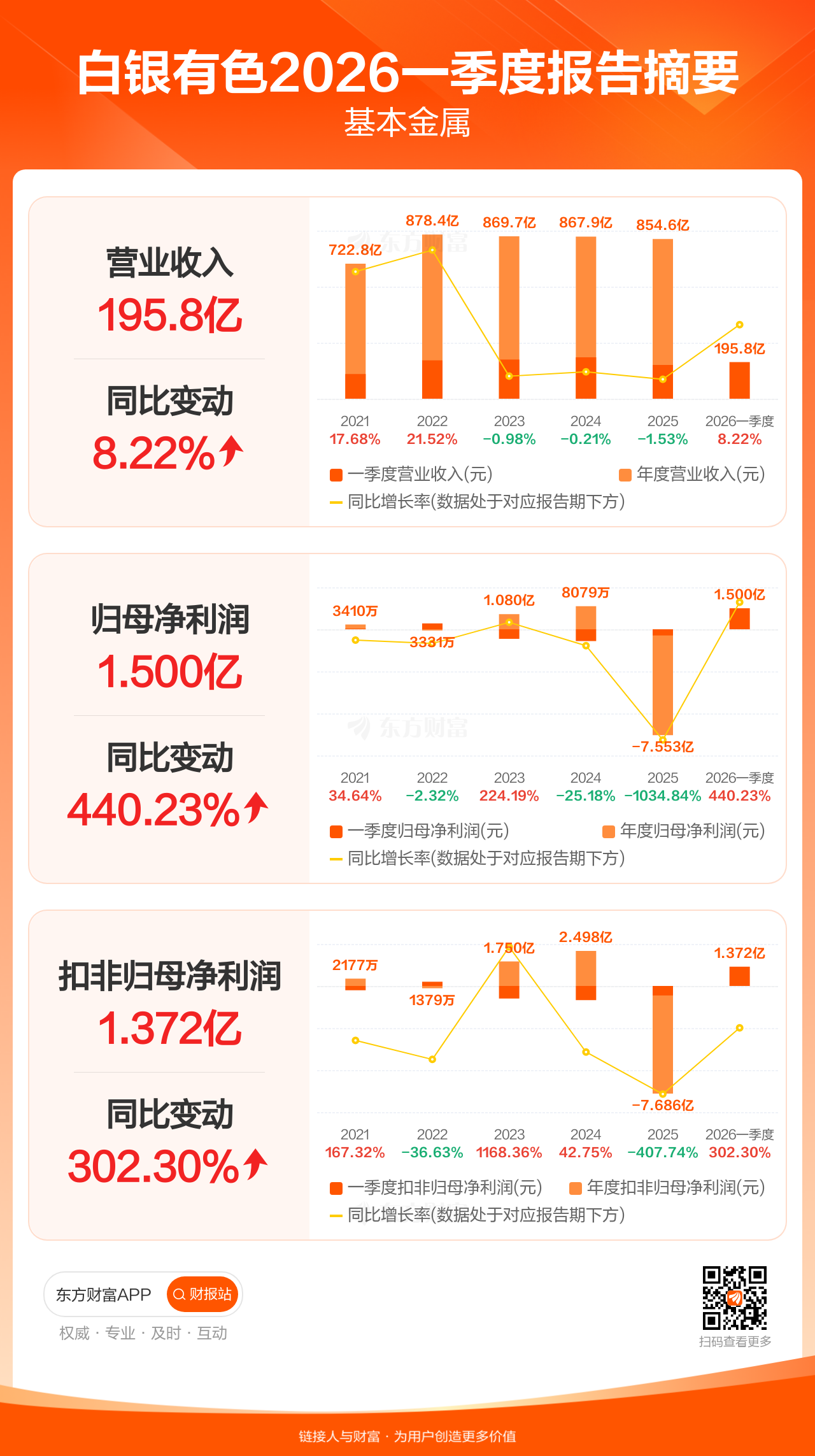 白银有色4月28日发布2026年一季报显示,公司一季度实现营业收入195.82亿元,同比增长8.22%;归母净利润1.50亿元,同比增长440.23%;扣非归母净利润1.37亿元,同比增长302.30%。