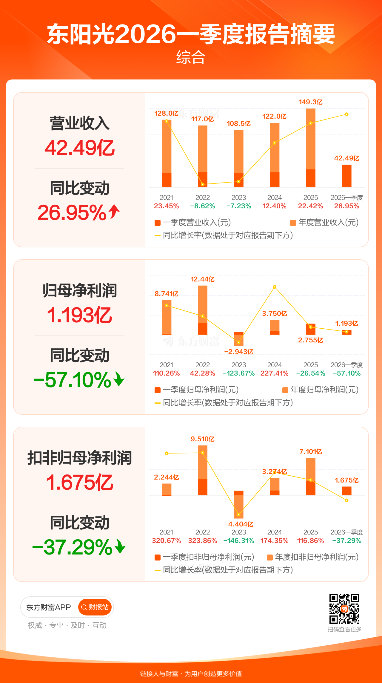 东阳光4月28日发布2026年一季报显示,公司一季度实现营业收入42.49亿元,同比增长26.95%;归母净利润1.19亿元,同比下滑57.10%;扣非归母净利润1.68亿元,同比下滑37.29%。