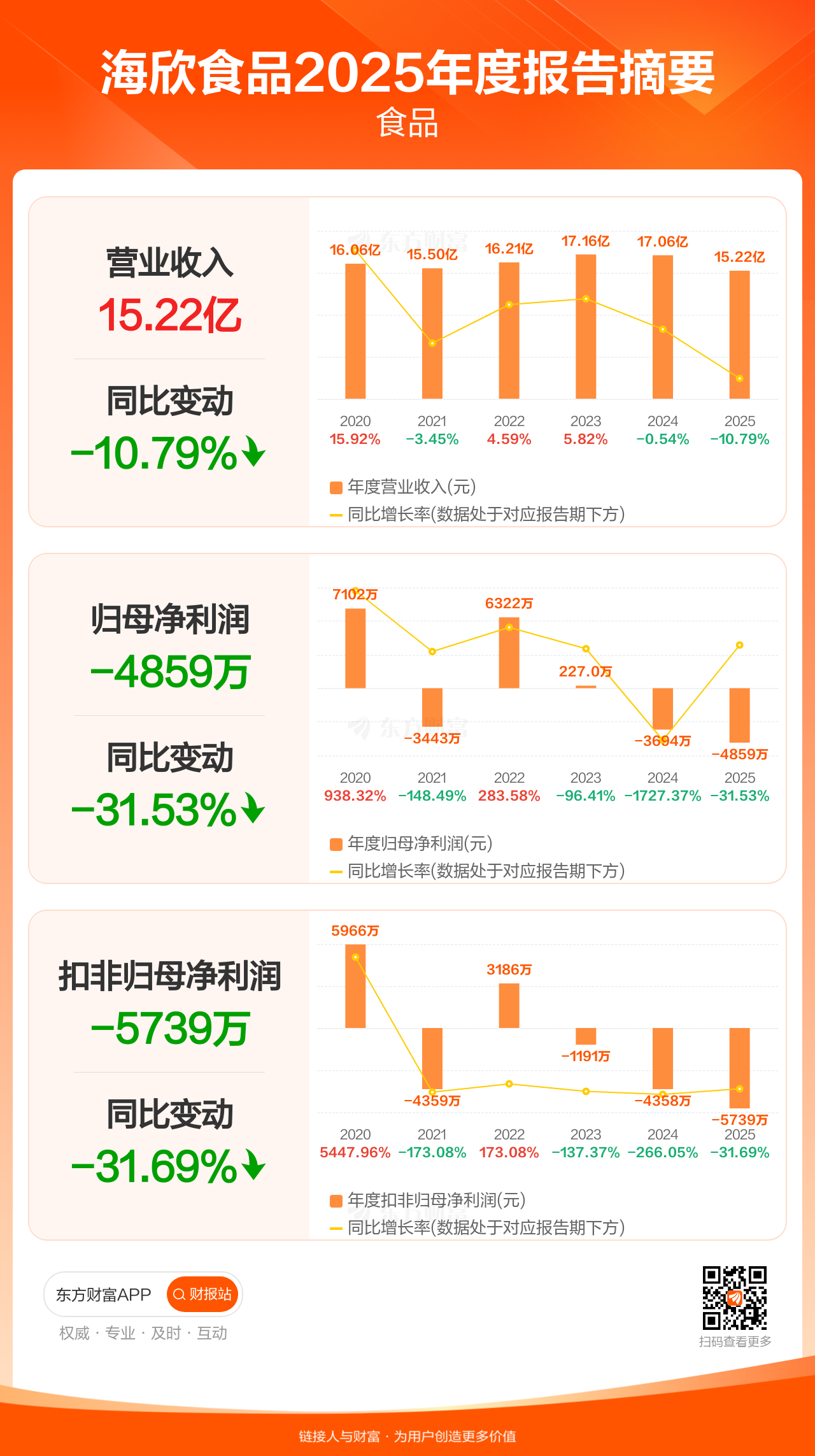 海欣食品4月28日发布2025年年报显示,公司全年实现营业收入15.22亿元,同比下滑10.79%;归母净利润-4858.99万元;扣非归母净利润-5739.26万元。