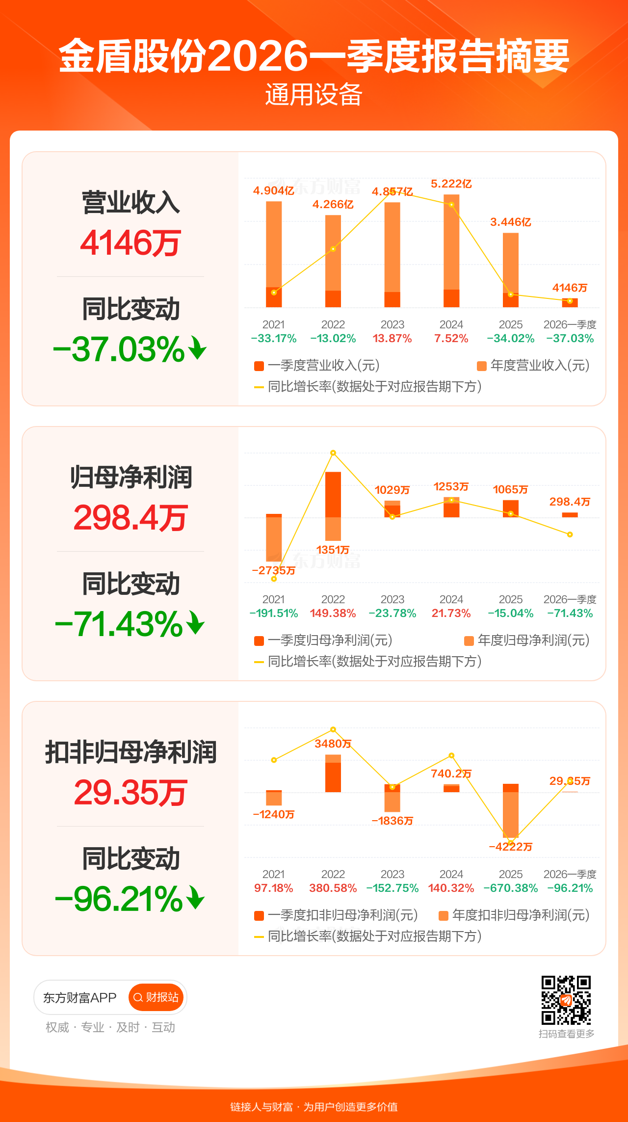 金盾股份4月28日发布2026年一季报显示,公司一季度实现营业收入4145.93万元,同比下滑37.03%;归母净利润298.39万元,同比下滑71.43%;扣非归母净利润29.35万元,同比下滑96.21%。