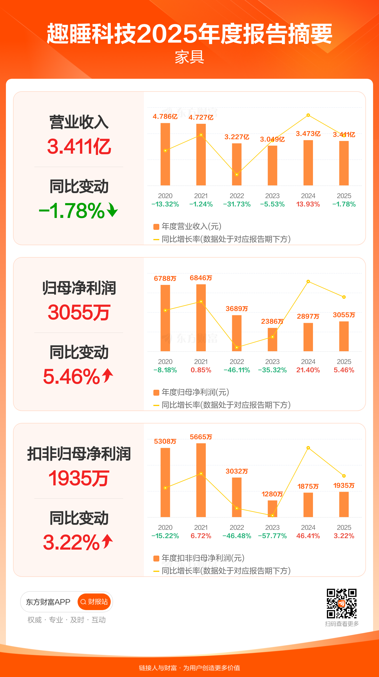 趣睡科技4月28日发布2025年年报显示,公司全年实现营业收入3.41亿元,同比下滑1.78%;归母净利润3054.69万元,同比增长5.46%;扣非归母净利润1935.09万元,同比增长3.22%。