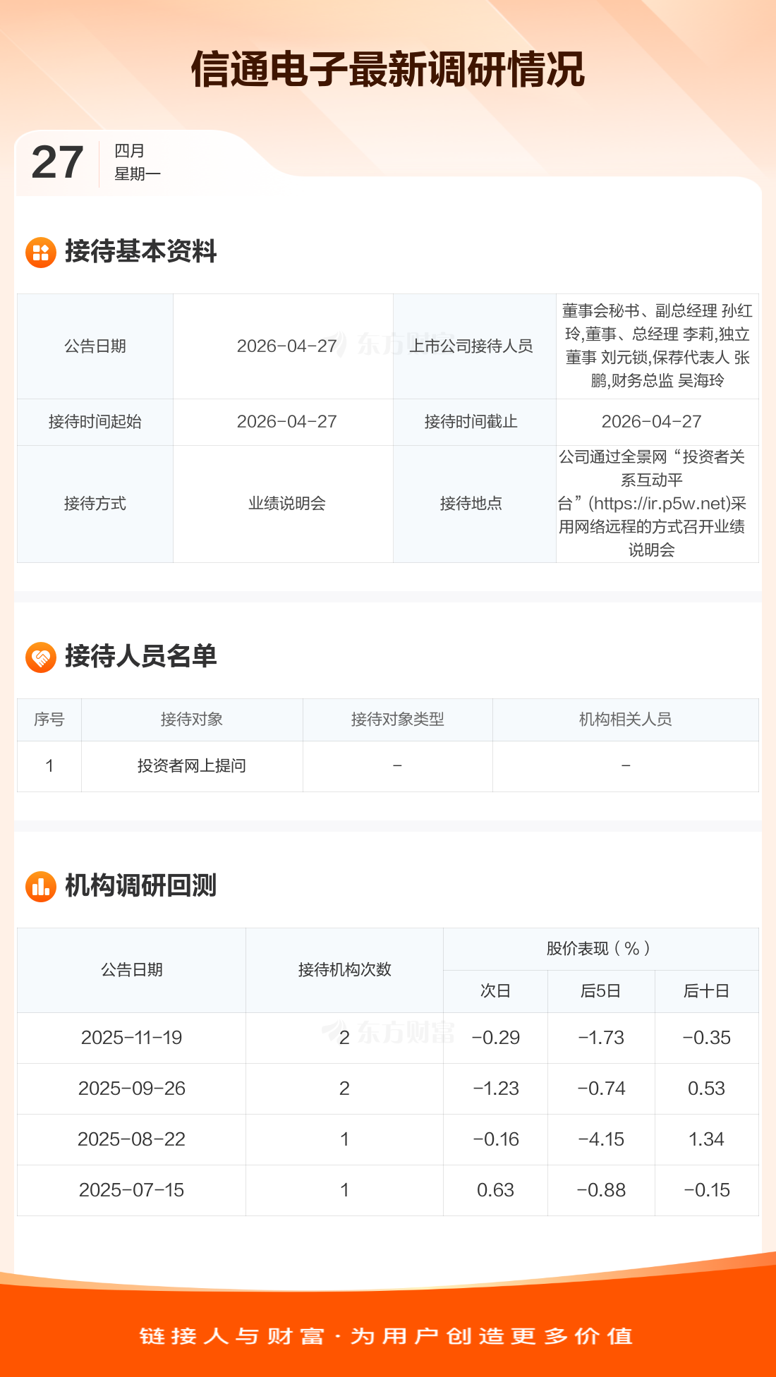 信通电子4月27日公告称,4月27日接待投资者网上提问调研。接待人员包括董事会秘书、副总经理 孙红玲,董事、总经理 李莉,独立董事 刘元锁,保荐代表人 张鹏,财务总监 吴海玲。