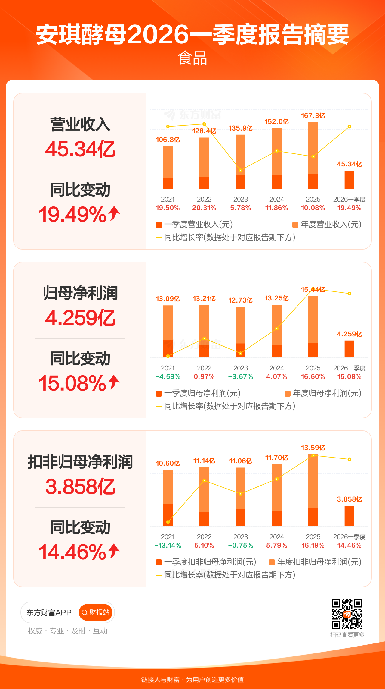 安琪酵母4月28日发布2026年一季报显示,公司一季度实现营业收入45.34亿元,同比增长19.49%;归母净利润4.26亿元,同比增长15.08%;扣非归母净利润3.86亿元,同比增长14.46%。