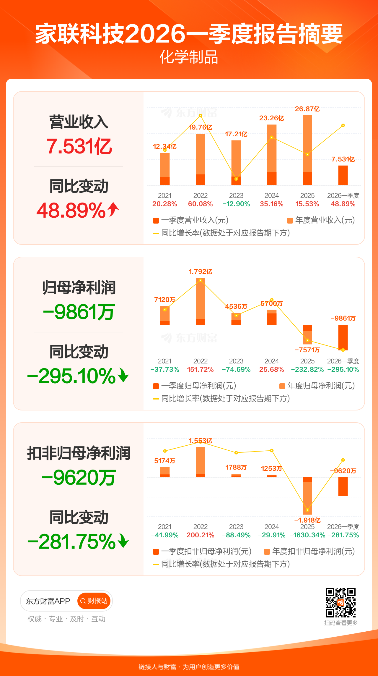 家联科技4月28日发布2026年一季报显示,公司一季度实现营业收入7.53亿元,同比增长48.89%;归母净利润-9860.70万元;扣非归母净利润-9620.47万元。