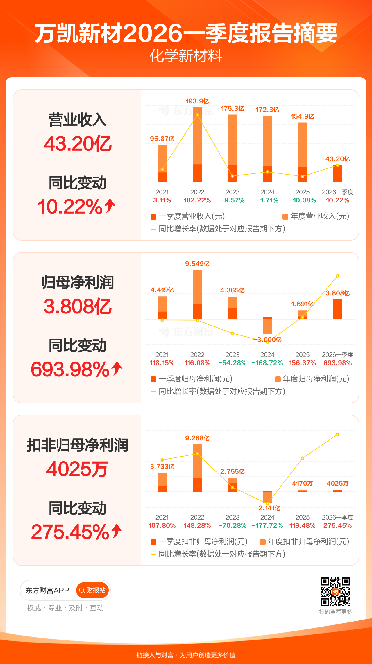 万凯新材4月28日发布2026年一季报显示,公司一季度实现营业收入43.20亿元,同比增长10.22%;归母净利润3.81亿元,同比增长693.98%;扣非归母净利润4024.83万元,同比增长275.45%。