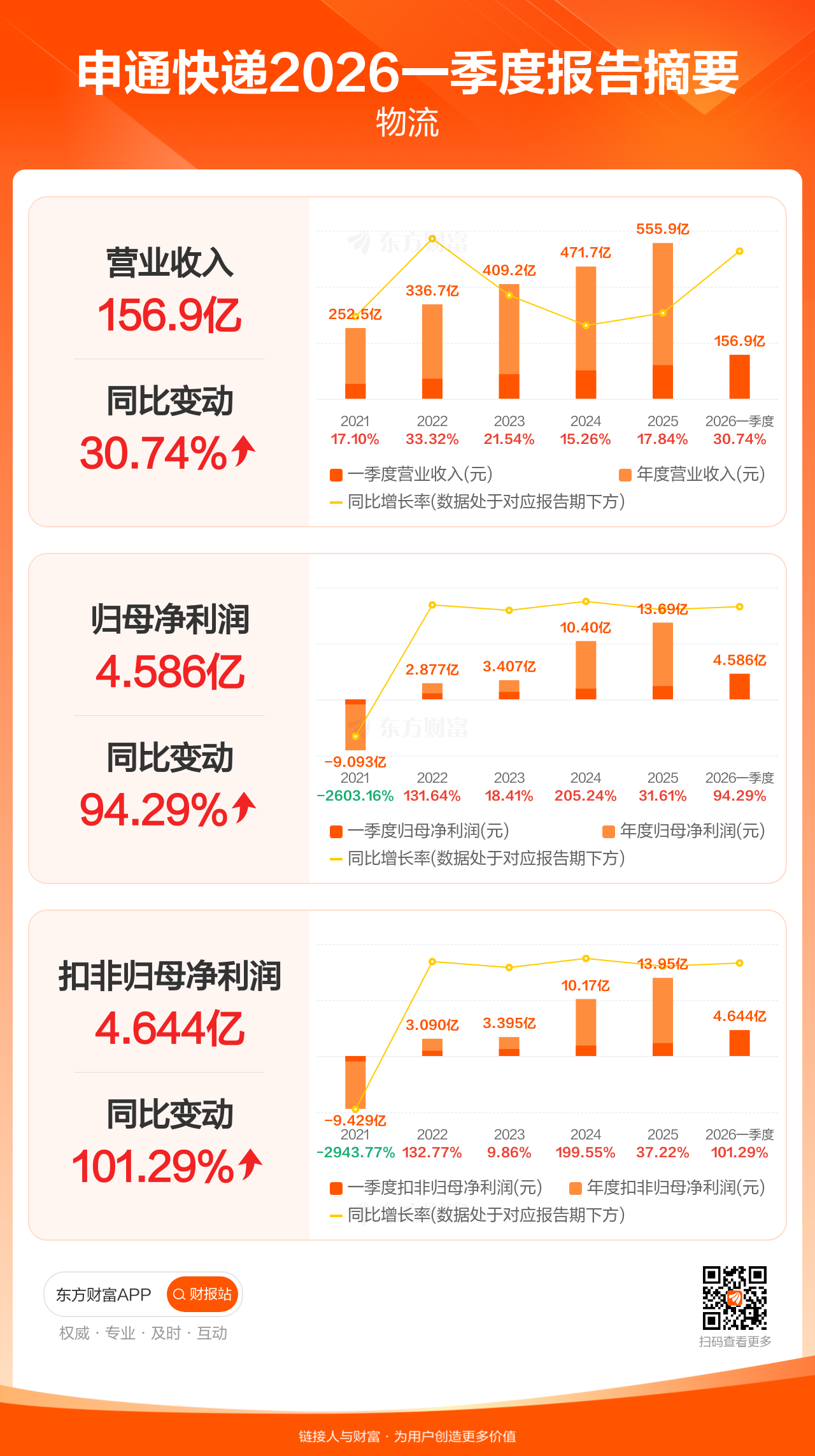 申通快递4月28日发布2026年一季报显示,公司一季度实现营业收入156.86亿元,同比增长30.74%;归母净利润4.59亿元,同比增长94.29%;扣非归母净利润4.64亿元,同比增长101.29%。