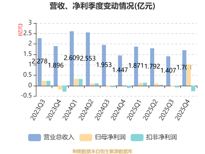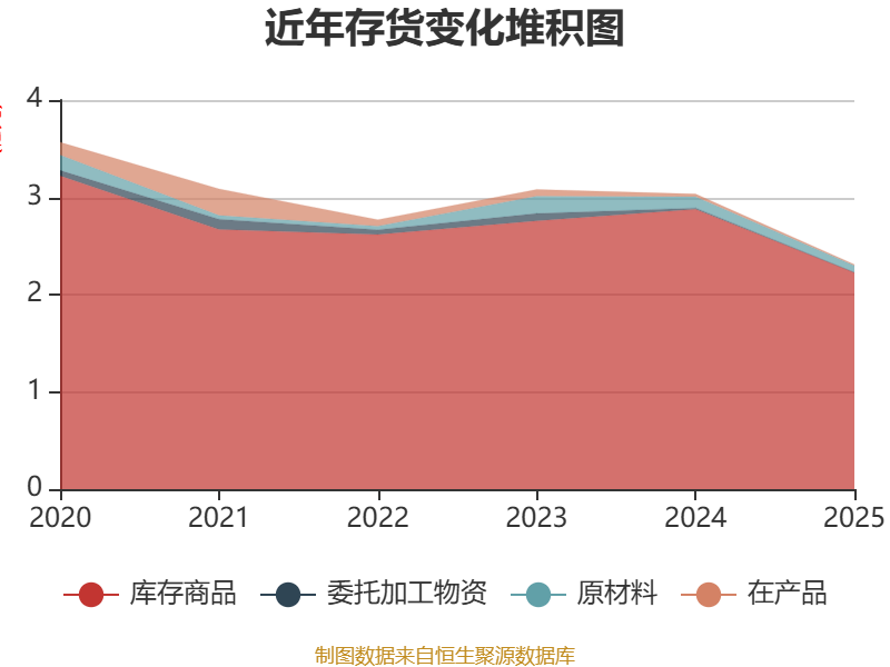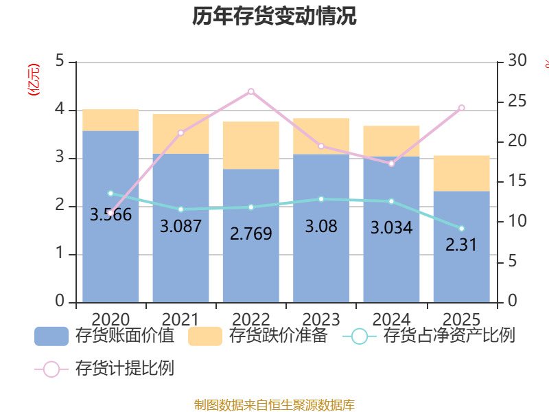 从存货变动来看,截至2025年末,公司存货账面价值为2.31亿元,占净资产的9.19%,较上年末减少7238.42万元。其中,存货跌价准备为7396.23万元,计提比例为24.25%。