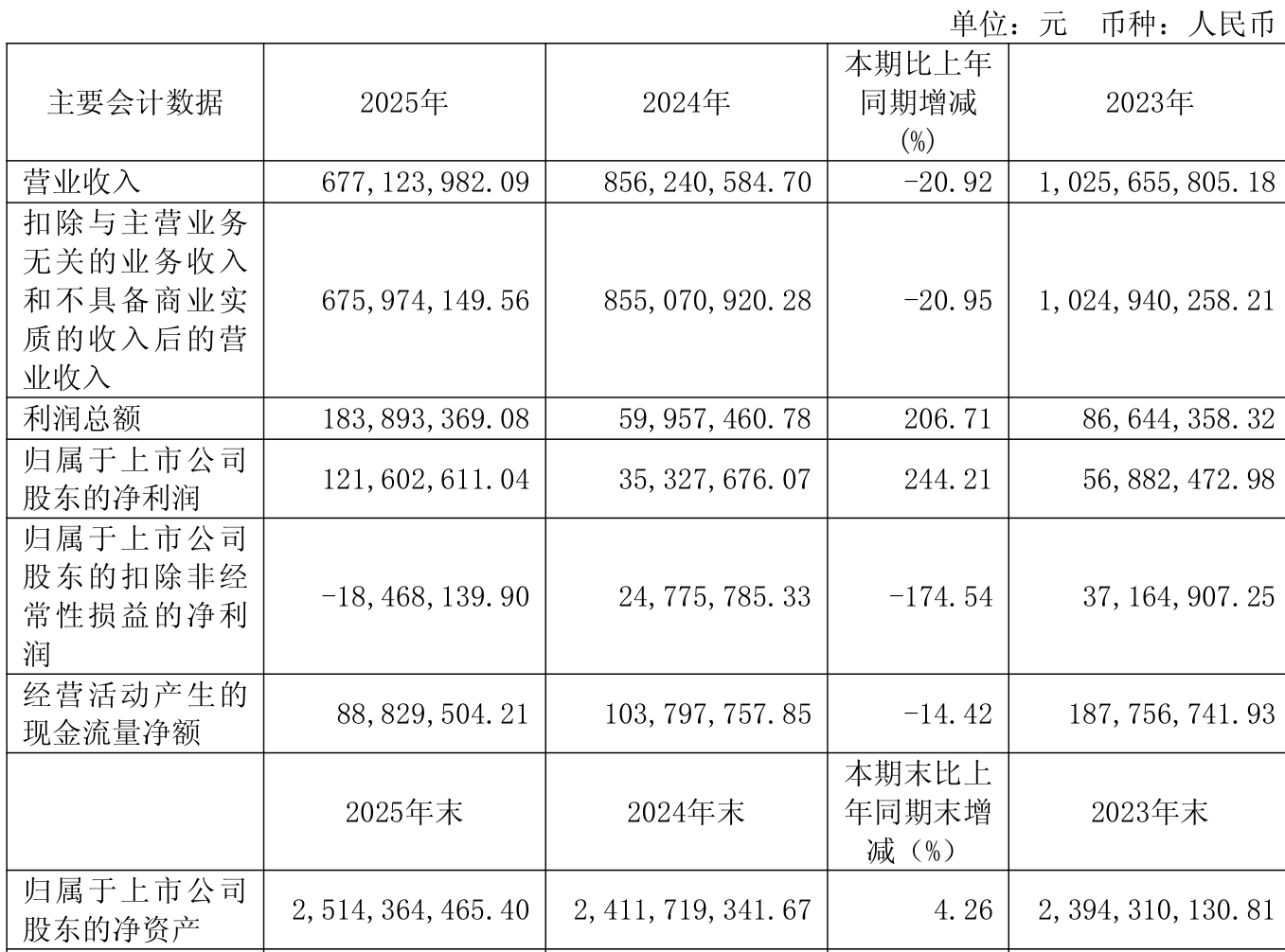 中证智能财讯益民集团(600824)4月28日披露2025年年度报告。2025年,公司实现营业总收入6.77亿元,同比下降20.92%;归母净利润1.22亿元,同比增长244.21%;扣非净利润亏损1846.81万元,上年同期盈利2477.58万元;经营活动产生的现金流量净额为8882.95万元,同比下降14.42%;报告期内,益民集团基本每股收益为0.115元,加权平均净资产收益率为4.94%。公司2025年度分配预案为:拟向全体股东每10股派现0.35元(含税)。