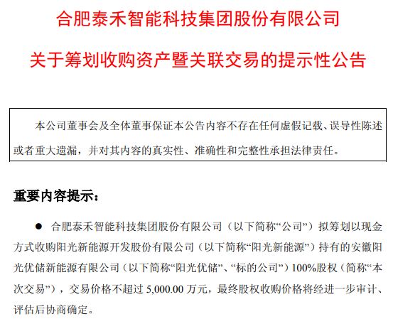 在完成这项高溢价的跨界交易仅半年后,相关的关联交易资产注入计划随之展开。2025年6月,泰禾智能发布公告称,拟以不超过5000万元现金向控股股东阳光新能源收购其持有的安徽阳光优储新能源有限公司100%股权,借此跨界进入工商业用户侧储能业务。