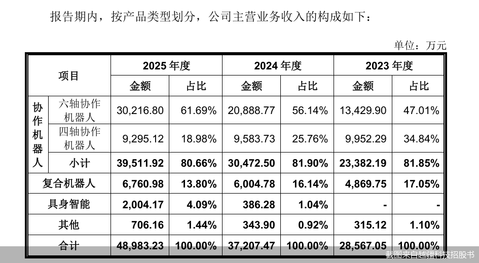 越疆科技A股IPO招股书的披露,也让公司目前产品收入占比及拳头产品价格随之公开,其中公司八成营收来自协作机器人,六轴协作机器人价格逐年走低,2023—2025年分别为5.66万元/台、4.72万元/台、3.82万元/台。另外,招股书中,也出现了不少可比明星公司,包括宇树科技、优必选以及曾经申报A股上市的节卡股份等。