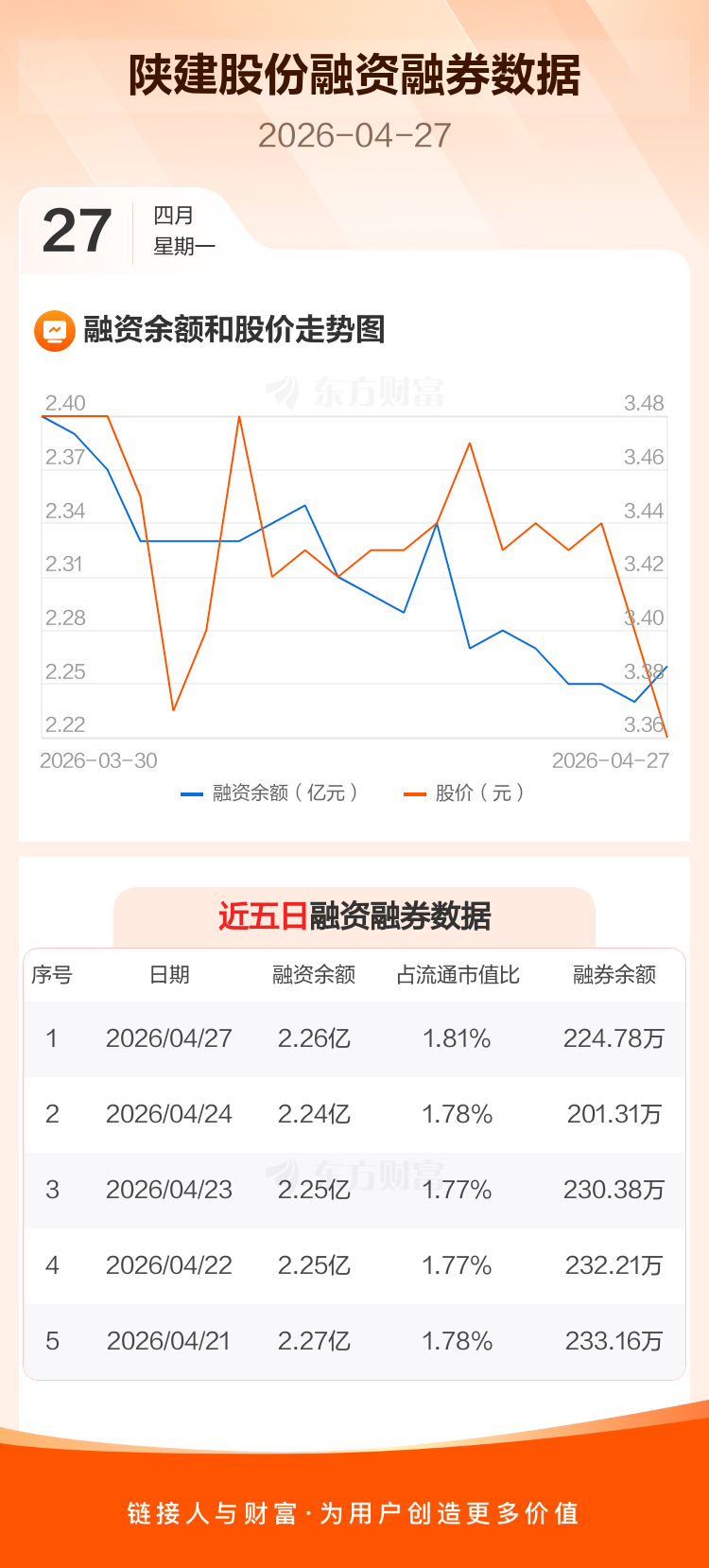 交易所最新数据显示,陕建股份于2026年4月27日获融资买入406.52万元,融资偿还285.54万元,当日融资净买入120.98万元。目前,该股融资余额2.26亿,占流通市值比例为1.81%。