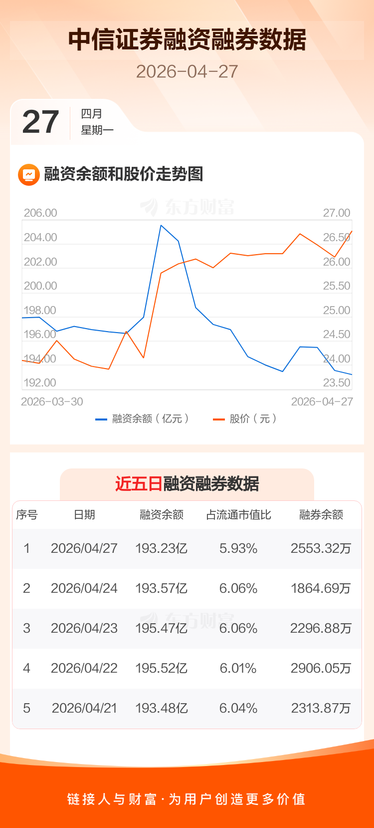 交易所最新数据显示,中信证券于2026年4月27日获融资买入6.20亿元,融资偿还6.54亿元,当日融资净偿还3376.23万元。目前,该股融资余额193.23亿,占流通市值比例为5.93%。