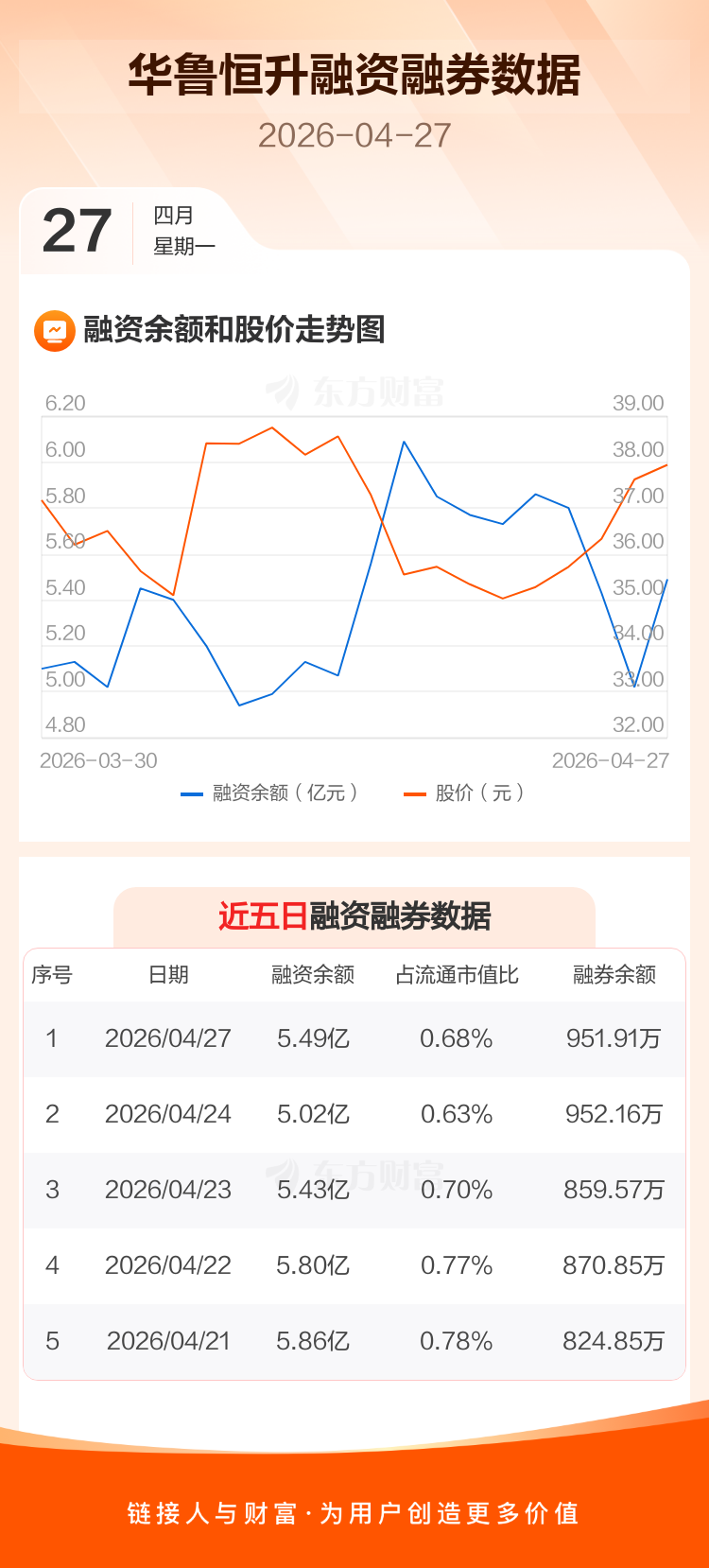 交易所最新数据显示,华鲁恒升于2026年4月27日获融资买入9277.60万元,融资偿还4528.68万元,当日融资净买入4748.92万元。目前,该股融资余额5.49亿,占流通市值比例为0.68%。