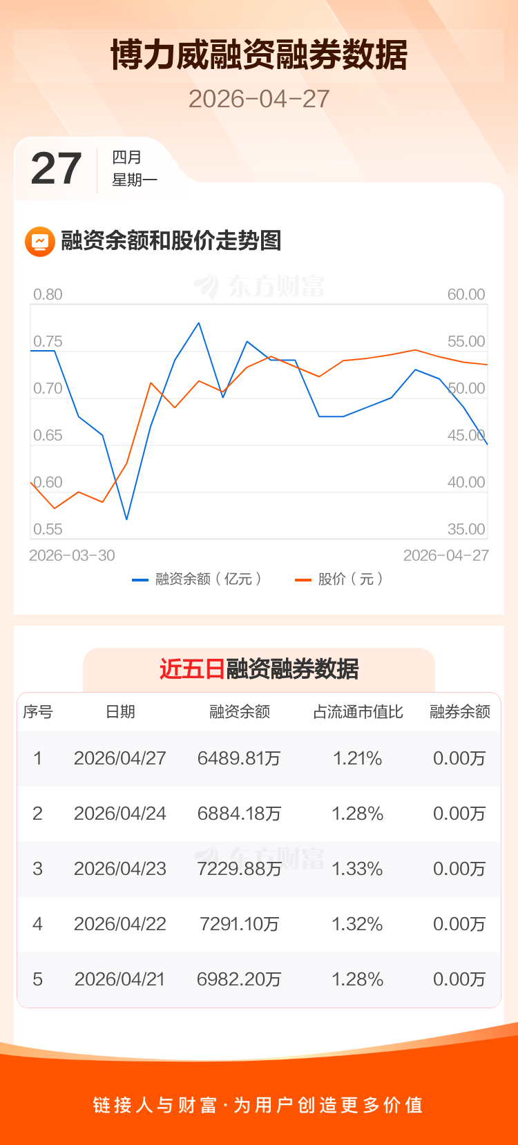 交易所最新数据显示,博力威于2026年4月27日获融资买入1728.08万元,融资偿还2122.45万元,当日融资净偿还394.37万元。目前,该股融资余额6489.81万,占流通市值比例为1.21%。