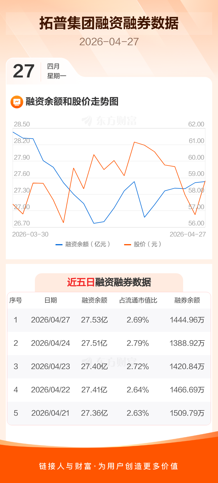 交易所最新数据显示,拓普集团于2026年4月27日获融资买入2.20亿元,融资偿还2.18亿元,当日融资净买入202.27万元。目前,该股融资余额27.53亿,占流通市值比例为2.69%。