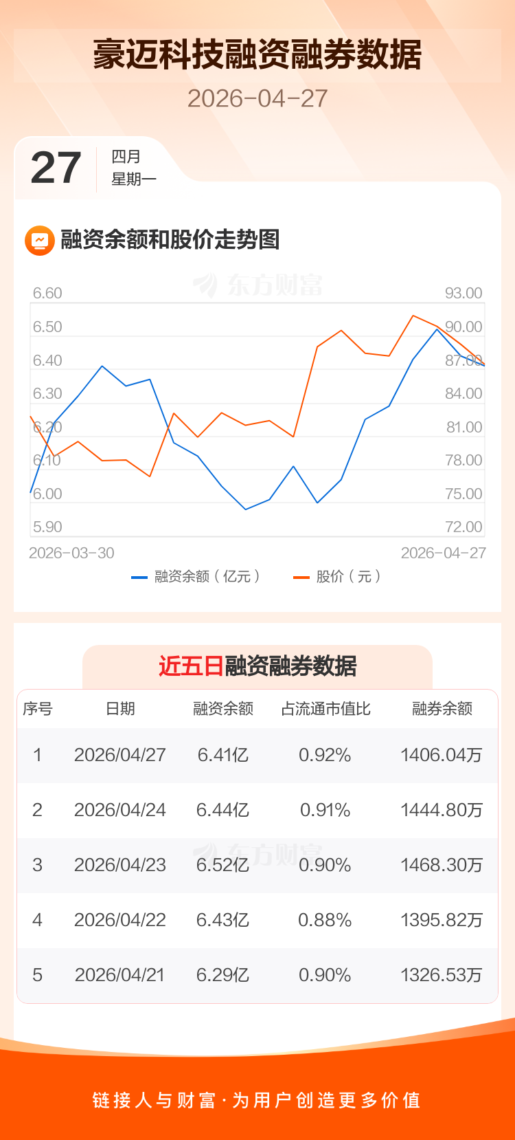 交易所最新数据显示,豪迈科技于2026年4月27日获融资买入1855.81万元,融资偿还2210.15万元,当日融资净偿还354.35万元。目前,该股融资余额6.41亿,占流通市值比例为0.92%。