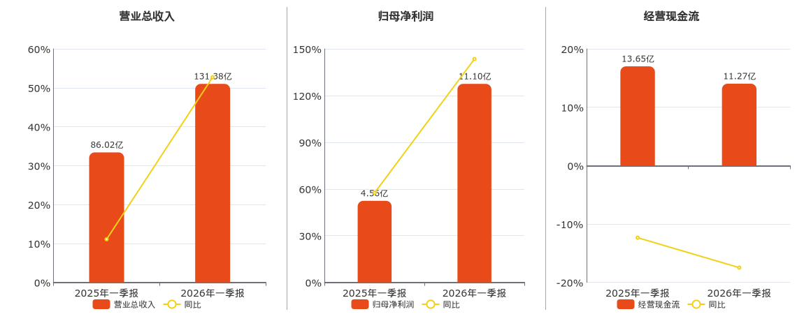 公司营业总收入为131.38亿元。归母净利润为11.10亿元。经营活动现金净流入为11.27亿元,较去年同报告期经营活动现金净流入减少2.39亿元,同比较去年同期下降17.48%。
