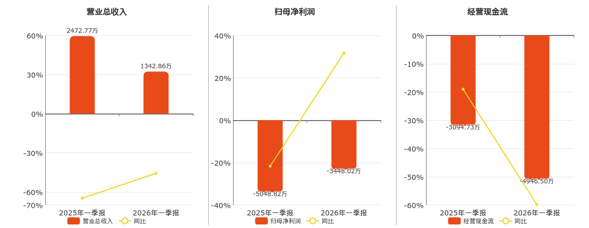 公司营业总收入为1342.86万元,在已披露的同业公司中排名第59,较去年同报告期营业总收入减少1129.91万元,同比较去年同期下降45.69%。归母净利润为-3448.02万元,在已披露的同业公司中排名第53。经营活动现金净流入为-4946.50万元,在已披露的同业公司中排名第33,较去年同报告期经营活动现金净流入减少1851.77万元。
