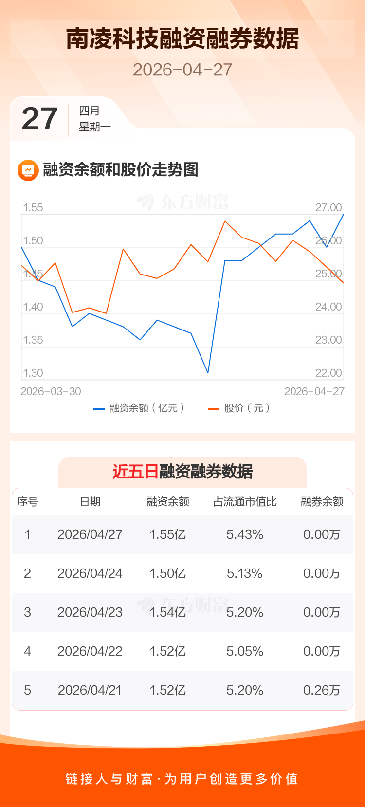 交易所最新数据显示,南凌科技于2026年4月27日获融资买入1808.92万元,融资偿还1253.26万元,当日融资净买入555.67万元。目前,该股融资余额1.55亿,占流通市值比例为5.43%。